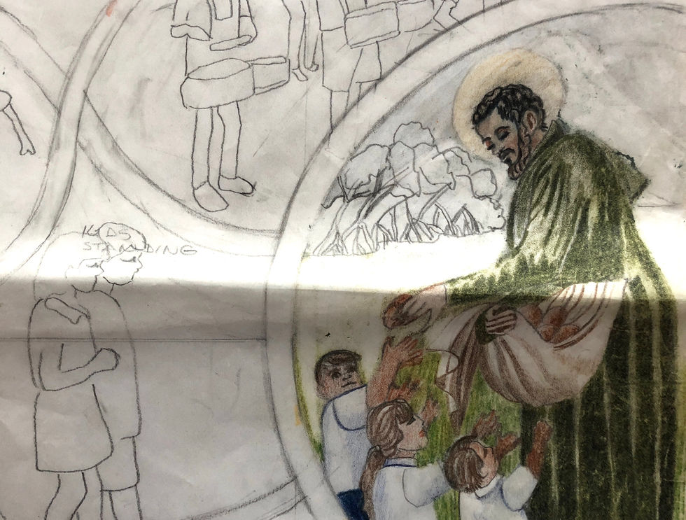 Saint Jerome Emiliani’s Mural is a request from the nuns who run the Gesuina Meltzi school in Costa del Sol, El Salvador. Saint Jerome is the patron Saint of their religious order and a symbol of a charitable spirit and solidarity with the poor. He worked with orphan children providing food, shelter, and education to many. The mural was requested after the Turtle Mural was painted, and I saw the need to bring both images together into a cohesive whole. The mural is divided into segments that can be painted during each visit to El Salvador. Starting with the image of the saint, because it was most important for the nuns, each section will depict an aspect of a regular school day for the children, which is made possible by the giving spirit and efforts of the nuns, who are in turn inspired by the Saint.